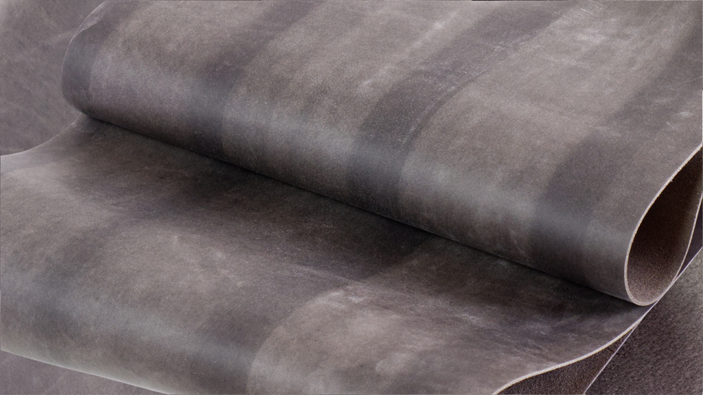 キメの細かさと高級感を持つキップ革(中牛革)の繊維を傷めないようにするため、1回のみの染色を施し、最後に特殊オイルワックスを手塗することで独特の表情を持たせたヌバック革です。
