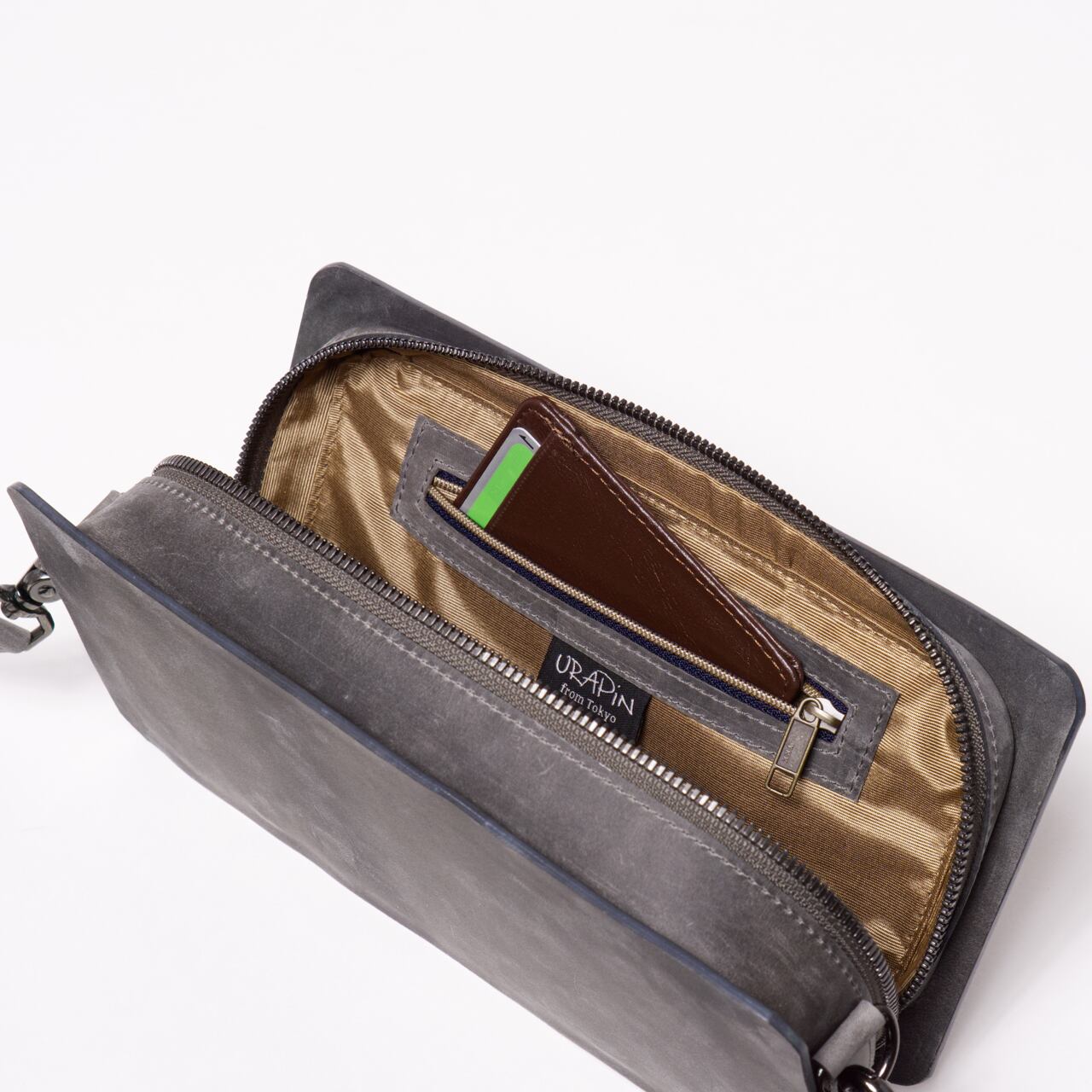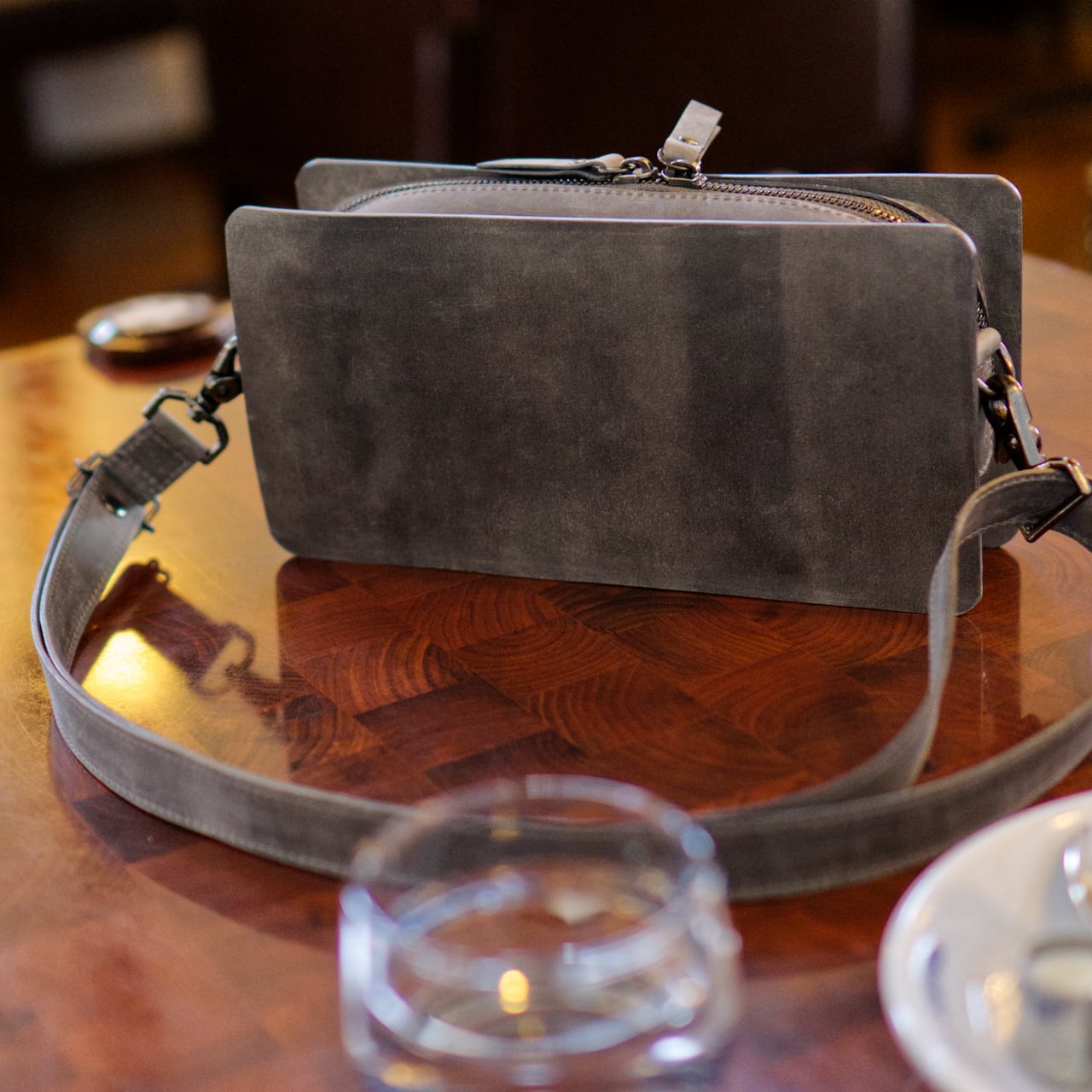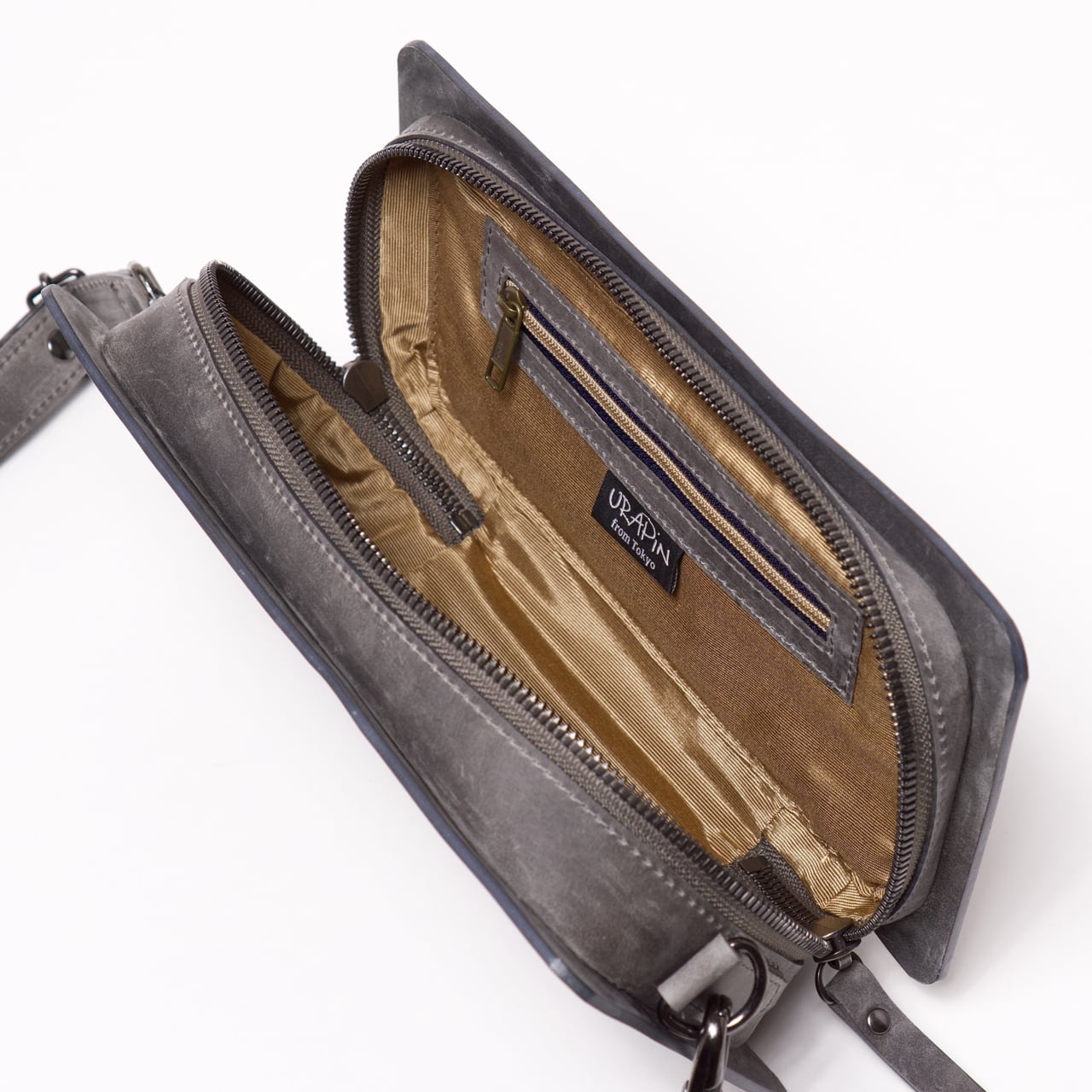 非常に良質なヨーロッパ産の本牛革を使用。ヌバック製法により、しっとりとした心地よい手触りのあるショルダーバッグに仕上がっています。