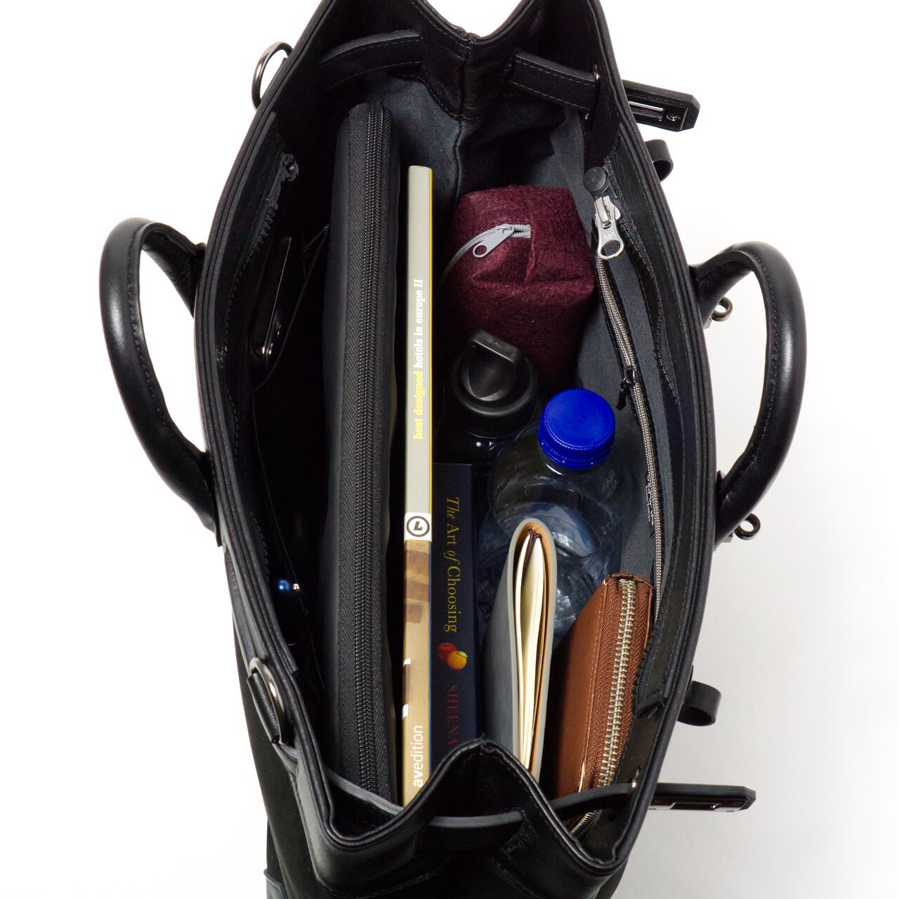 バッグの中身は16インチのノートPCがしっかり入り、さらにマチを幅広く設けているので容量はたっぷり。機能性も持ち合わせた上品で洗練されたデザインが特徴のバッグに仕上がっています。