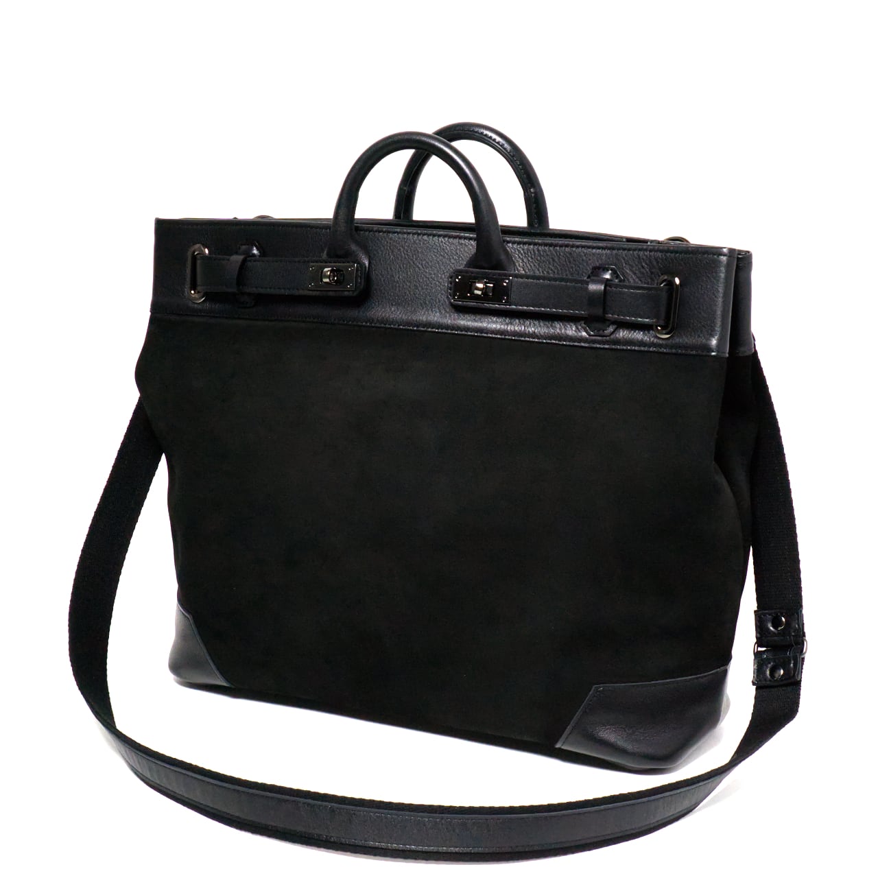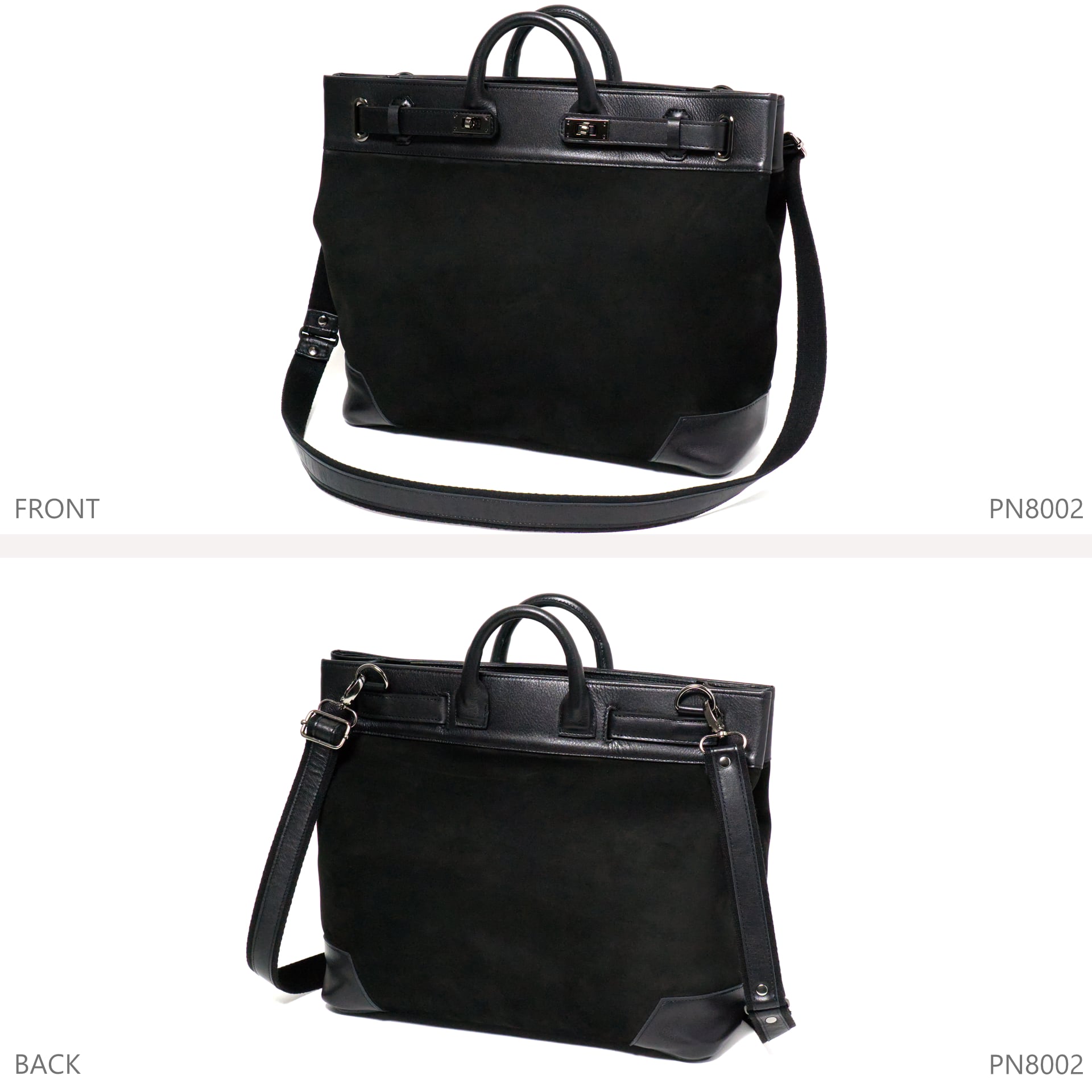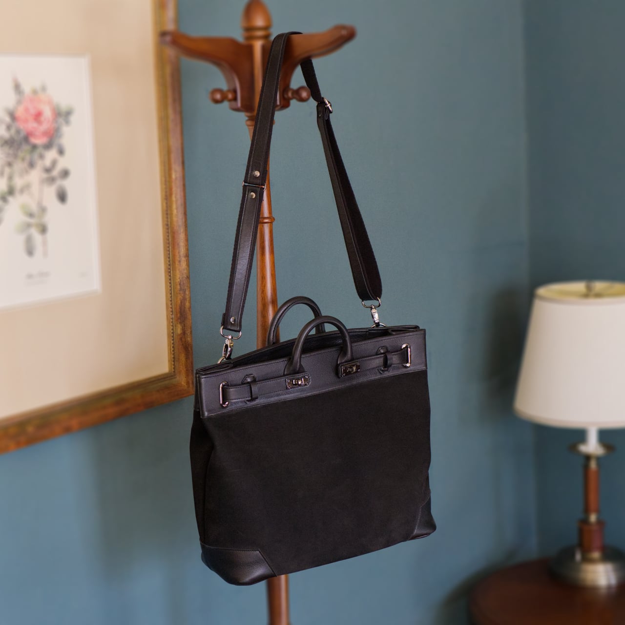 艶のある上質なスムースレザーと、なめらかな感触が魅力のヌバックレザーを使用した2ウェイショルダーバッグ。高級感と落ち着きのあるブラックカラーが、ビジネスシーンや友人とのお出かけなど、ちょっとお洒落したい場面で活躍します。